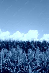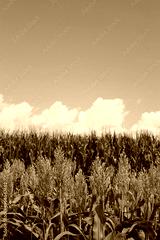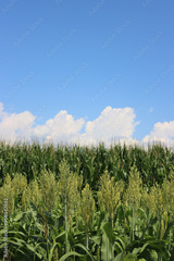 Green Sorghum field near corn field agaisnt blue sky with white clouds. Sorghum plants growing in the field