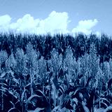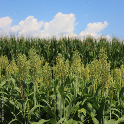 Green Sorghum field near corn field agaisnt blue sky with white clouds. Sorghum plants growing in the field