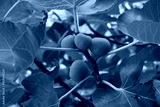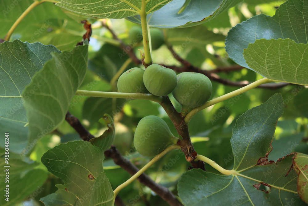 Many green unripe figs on tree in the orchard. Summer fruits. Ficus carica tree
