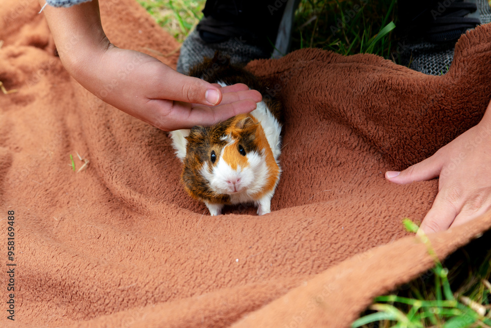 A boy plays in the park with a fluffy brown and white guinea pig.