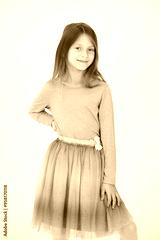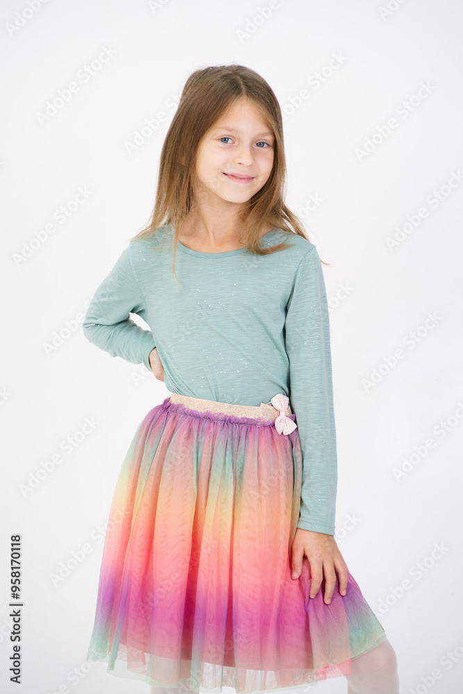 Little girl posing on white background in bright multi-colored guipure skirt.