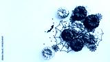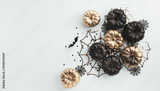 Halloween party decorations from pumpkins, bats, spider web top view. Happy halloween holiday greeting card flat lay style..