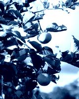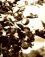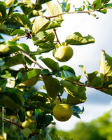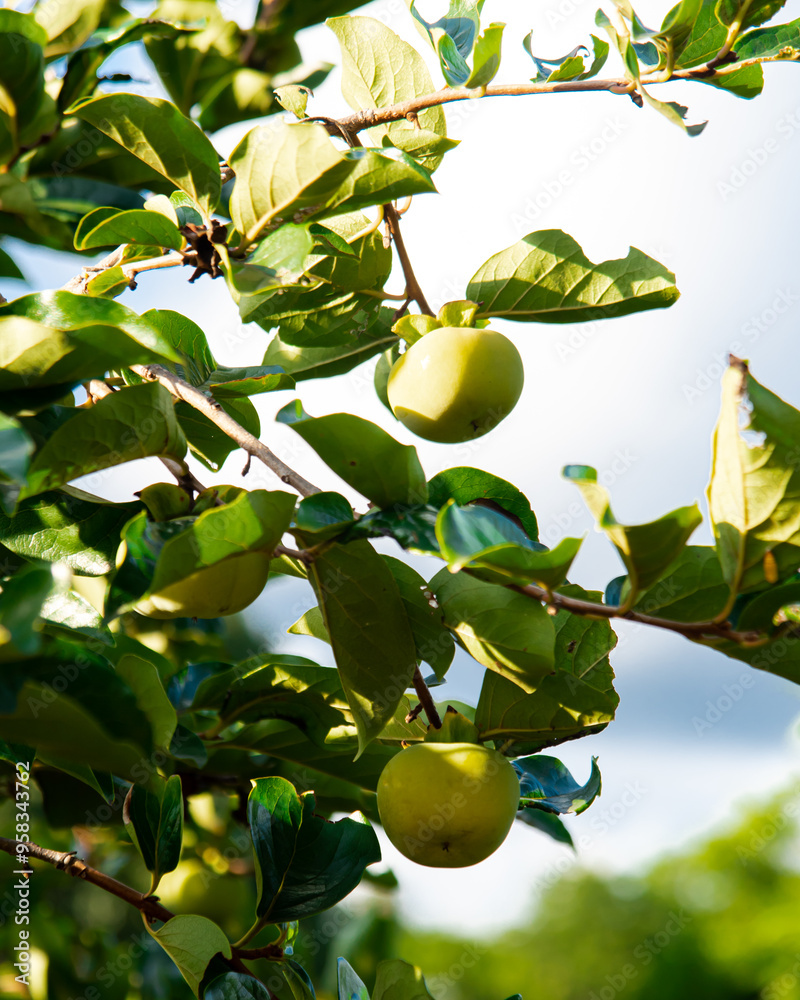 Green persimmon Diospyros kaki hanging on tree branch under sunny blue sky at front yard garden in Austin, Texas, urban edible landscaping and fruit orchard, unripe fruit with lush green leaves