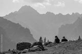 widok na grań Tatr Wysokich, w tym Gerlach, z Rusonowej Polany, para turystów na łące, lato w górach