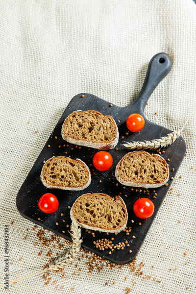 Delicious fresh bread cut into slices. Fresh craft pastries.