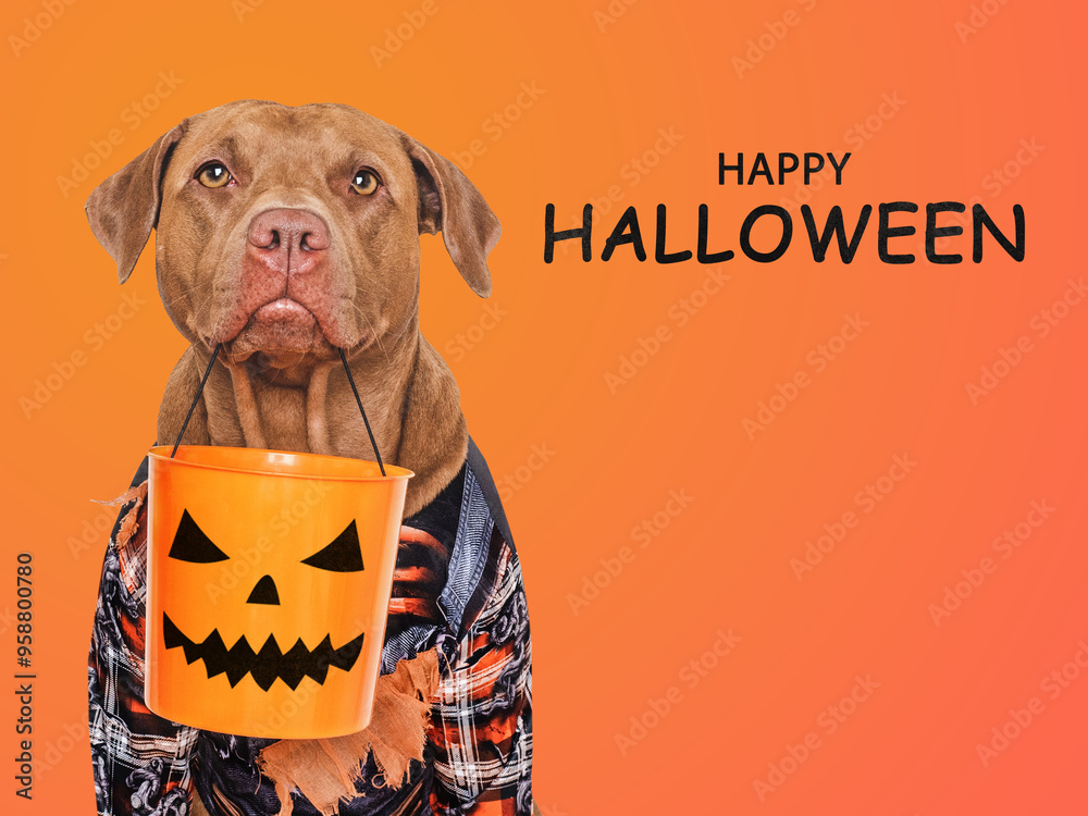 Happy Halloween. Charming dog and Halloween costume. Isolated background. Close-up, indoors. Studio shot. Congratulations for family, relatives, loved ones, friends, colleagues. Pet care concept