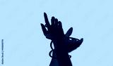 Painted blue two hands aesthetic Network connection on yellow background. Art collage digital pop modern art.