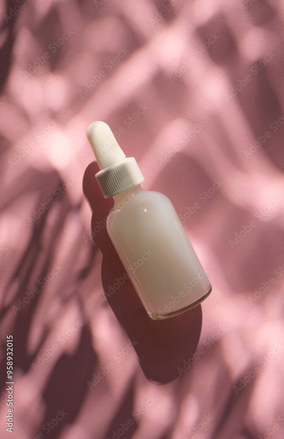Cosmetic serum glass bottle on the pink background with under water sun shadow.
