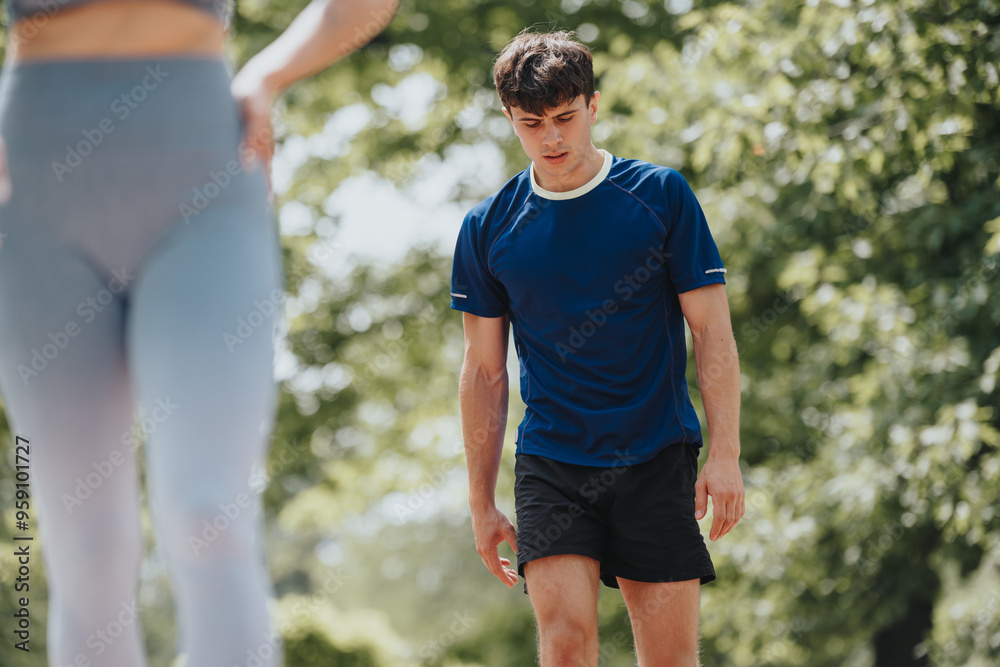 Young athletes cooling down after an intense workout session in an outdoor park, showcasing fitness and healthy lifestyle.