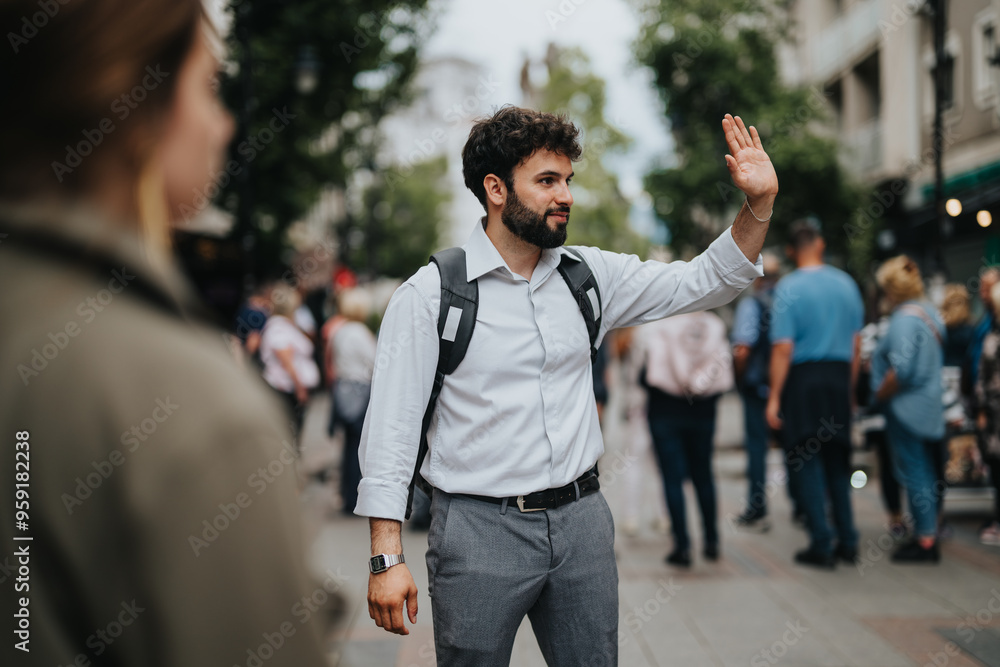 Young businessman with backpack waving while navigating through a crowded urban street. Professional and busy atmosphere with people around.