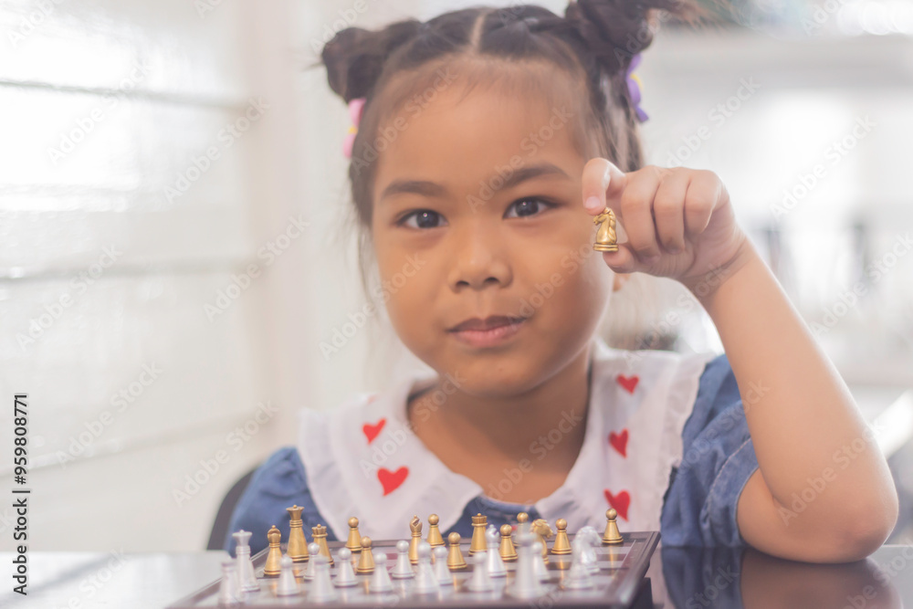 Concept of kid learning, strategy, education, friendship, competition. Asian little girl is playing chess board game in the living room with happy moment. Selective focus on chess pieces in hand.