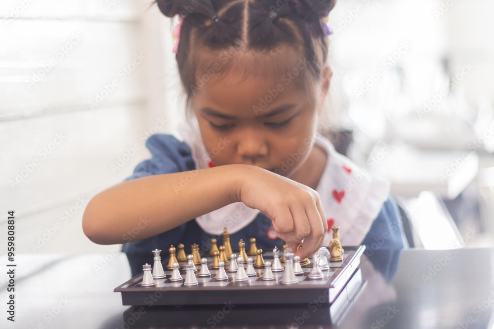 Concept of kid learning, strategy, education, friendship, competition. Asian little girl is playing chess board game in the living room with happy moment. Selective focus on chess pieces in board.