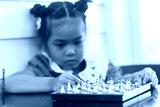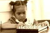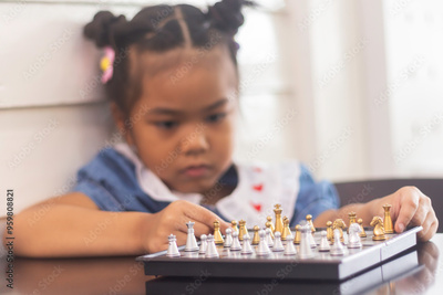 Concept of kid learning, strategy, education, friendship, competition. Asian little girl is playing chess board game in the living room with happy moment. Selective focus on chess pieces in board.