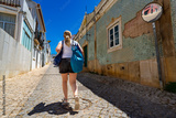 Summer vacation. Woman dressed sporty walking on street and sightseeing european old city on sunny summer day. Visit old town of Lagos in Portugal.