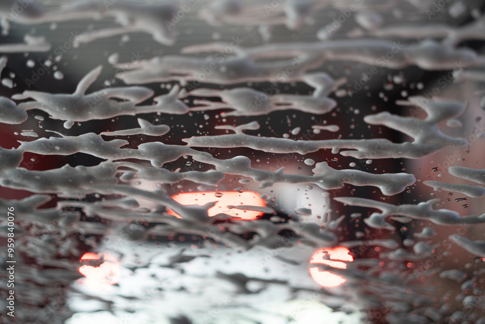 Soapy water blowing up window from automatic car wash, Automatic car wash