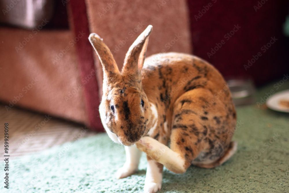 A domestic brown spotted rabbit grooms itself while sitting in a room.