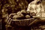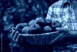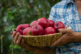 an elderly woman holds apples in the garden. Selective focus