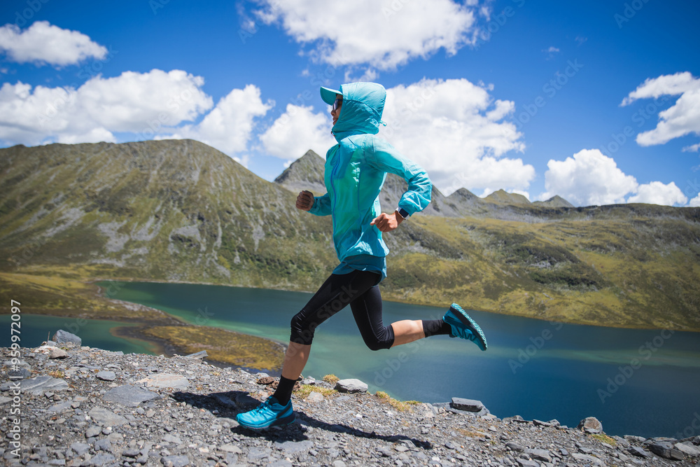 Fitness woman runner running at beautiful mountain top