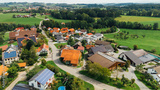 Aerial View of Village Rooftops and Farm in Germany with Solar Panels