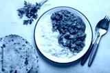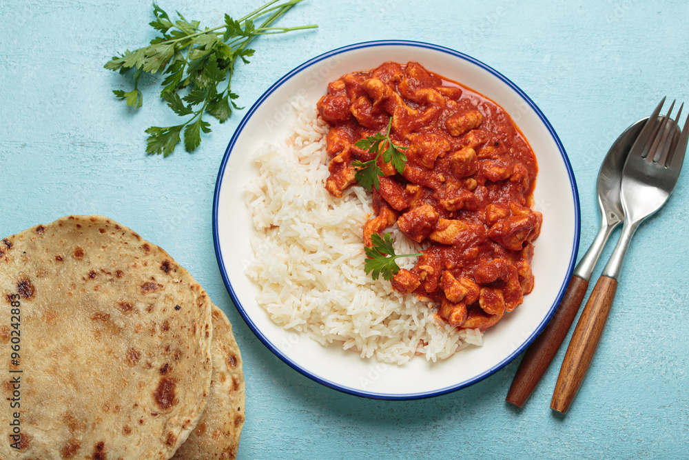 Delicious chicken curry with basmati rice, chapati, and cutlery on blue background. Top view shows homemade Indian meal. Spicy and tasty for lunch or dinner