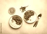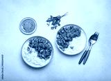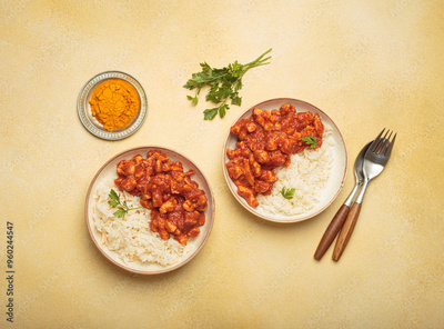 Two portions of chicken curry garnished with fresh coriander served with white basmati rice on a yellow background with turmeric and cutlery