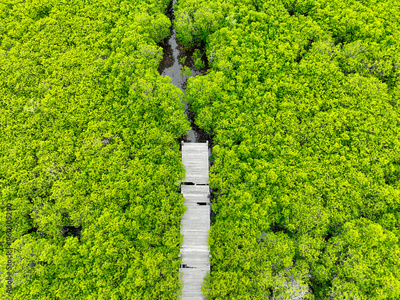 Aerial view lush green mangrove forest. Wooden bridges for natural trails, highlighting ecotourism opportunities, carbon capture benefits, and vital role mangroves play in combating climate change.