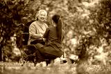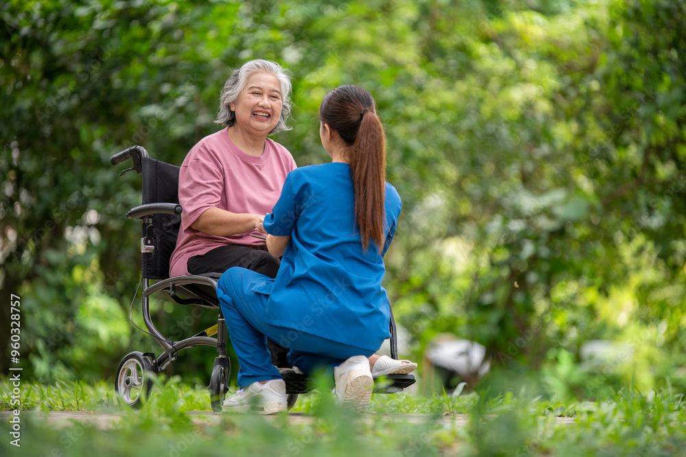 Elderly woman seated in a wheelchair with young caregiver or healthcare worker is standing behind reflects care, compassion, and a supportive relationship the caregiver and elder healthy concept.