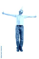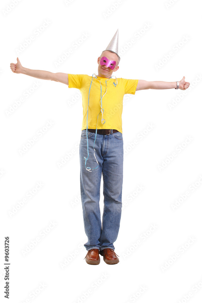 Young man in carnival mask and hat showing thumbs up
