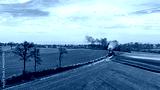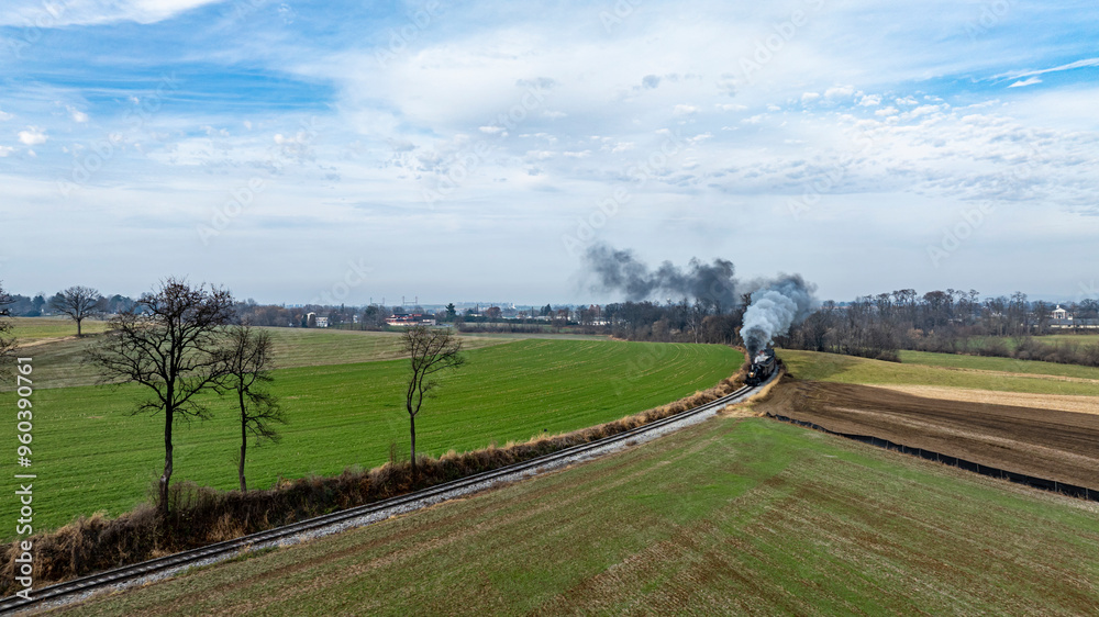 A steam locomotive chugs along a winding track surrounded by lush green fields and distant trees. The sky is partly cloudy, adding a serene atmosphere to the springtime scenery.