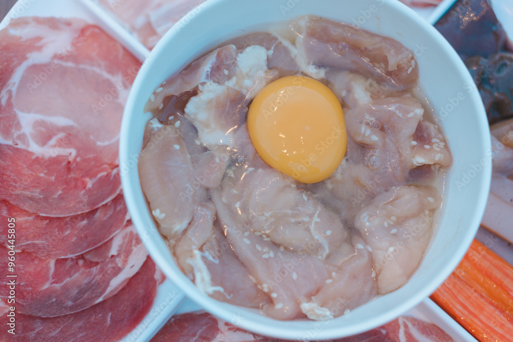 Marinated meat with egg yolk in a bowl and various food used as a barbecue ingredient in buffet in Thai grilled pork for concept is pork pan.