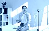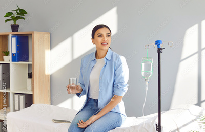 Beautiful young woman with sterile needle in arm sitting on medical bed by IV drip stand at clinic, holding glass, drinking water, and receiving vitamin therapy infusion for her immune system