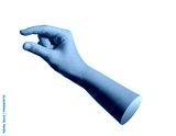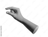 A hand using two fingers to hold and measure an invisible, small object isolated on a white background