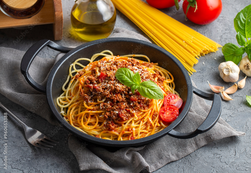 Pasta spaghetti bolognese with minced beef sauce, tomatoes, parmesan cheese and fresh basil in a plate