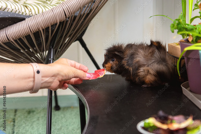 A woman hand feeds a black fluffy guinea pig