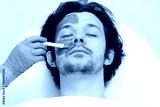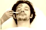 A handsome man receives a rejuvenating mask from a beauty expert. Highlight skin lifting and advanced skincare treatments in your advertising. Perfect for showcasing professional facial care.