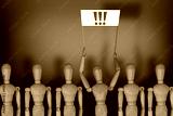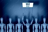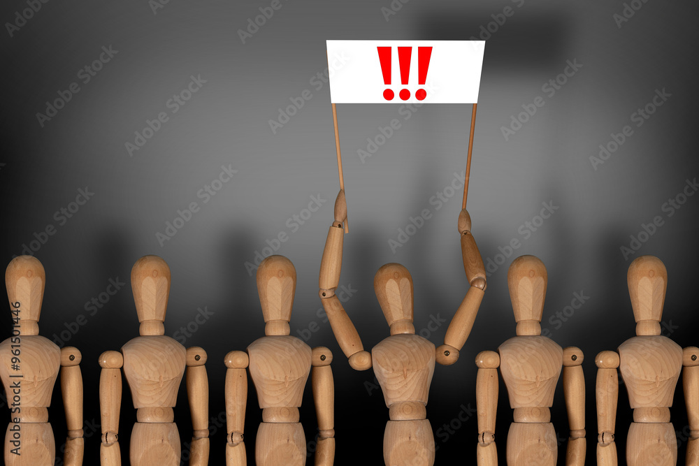 A wooden puppet doll marionette holding protest sign. Concept of emotional manipulation, world conspiracy theories., control and dictatorship.