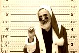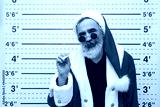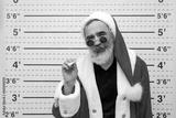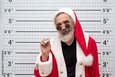Bad Santa Claus smoking a hand-rolled cigarette, Police Mugshot Board backdrop of a ruler with height. Natural beard, red hat, suit