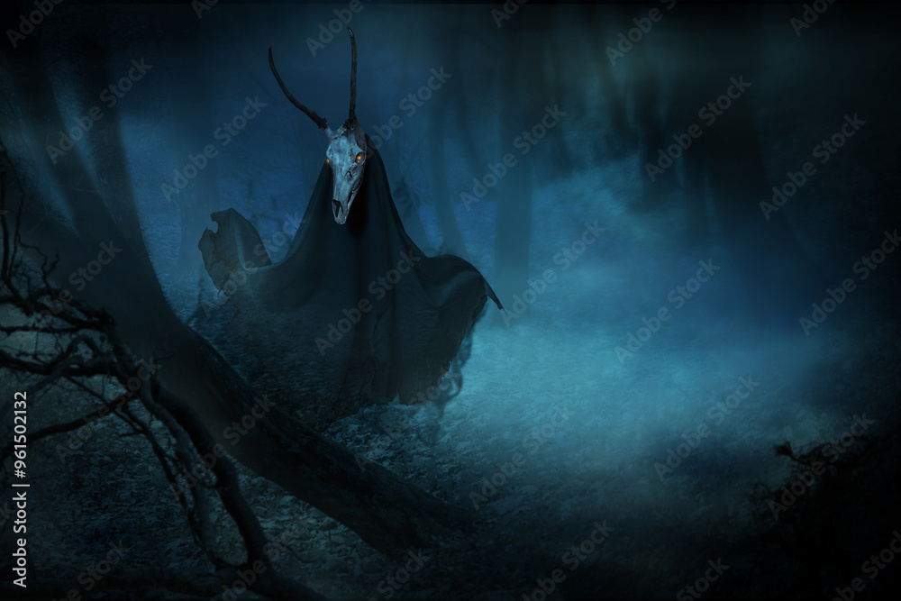 Floating scary white fabric ghost pagan with roe deer skull horns appeared among in the dark forest in a nightmare. Creepy ghost Halloween character