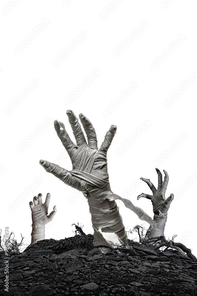 Mummy's hands wrapped in a bandage creepily moving reaches up through the ground grave on isolated background. The hand of the mummy monster for Halloween horror concept