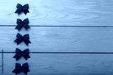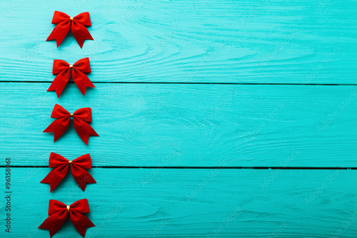 Frame of Christmas accessories on blue wooden background. Top view