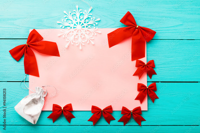 Christmas card with red bows on blue wooden background. Copy space and top view