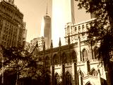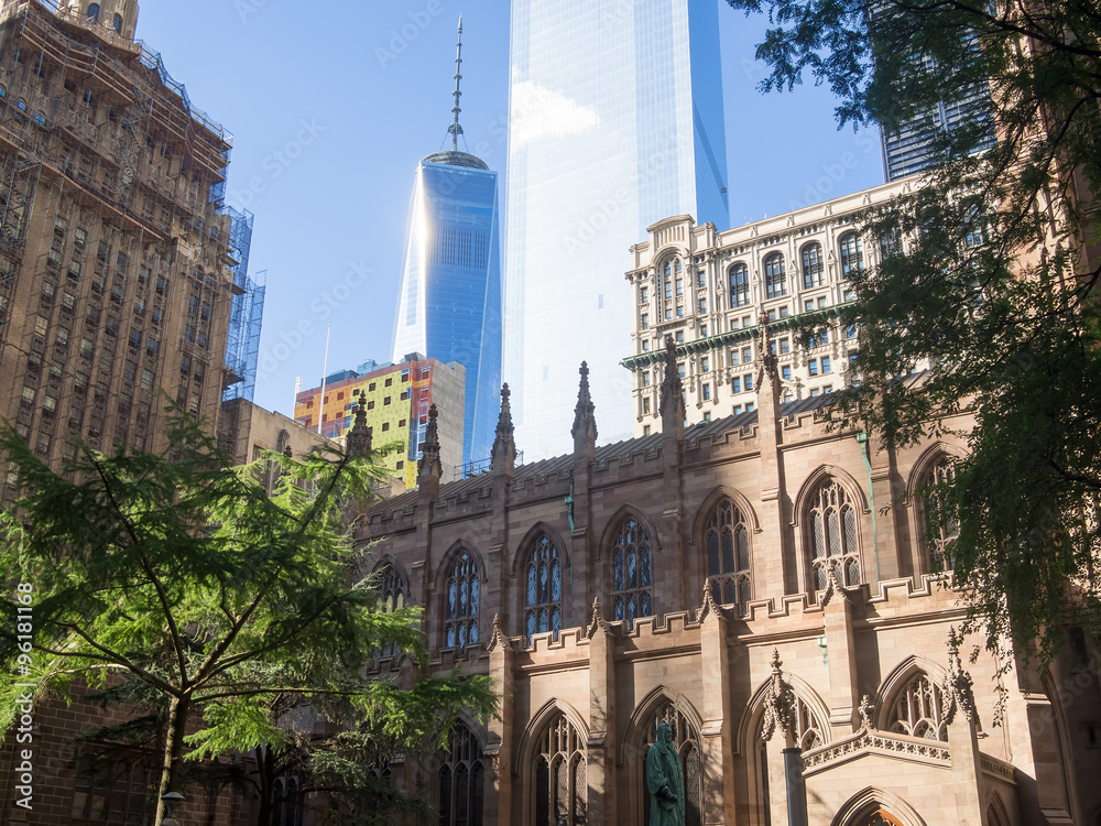 Trinty Church in New York City with skyscrapers on the backgroun
