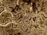 Nature from a drone. Aerial view of a meandering river in a field. Scene from air. Landscape during sunset and soft light. Photo for background and wallpaper.
