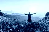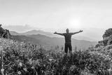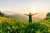 happy man watching amazing highland evening sunset, person delight with nature landscape