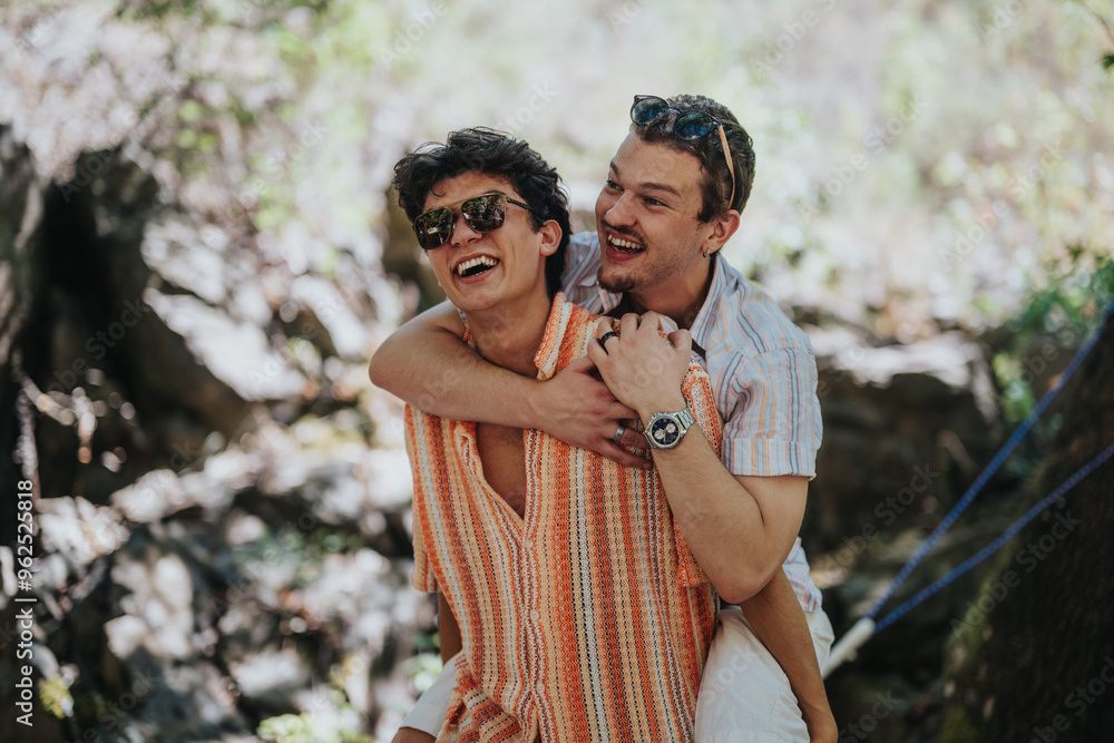 Two young men share a happy and carefree moment outdoors. They are smiling, wearing sunglasses, and enjoying each other's company in a natural setting.