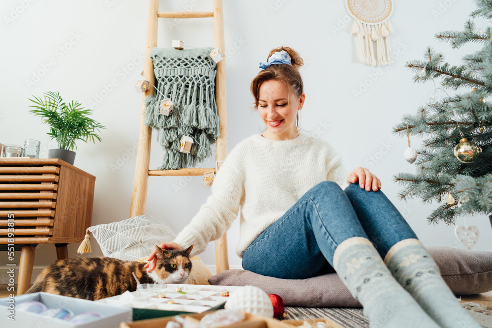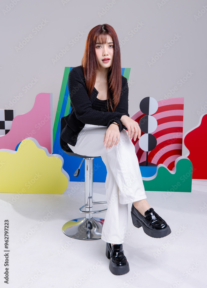Fashion photo young confident woman model Asian beautiful female wearing trendy black color knitted short jacket and white jeans posing looking at camera, sitting on tall stool on colorful background.
