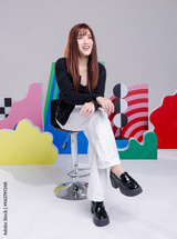 Fashion photo young confident woman model Asian beautiful female wearing trendy black color knitted short jacket and white jeans posing looking at camera, sitting on tall stool on colorful background.