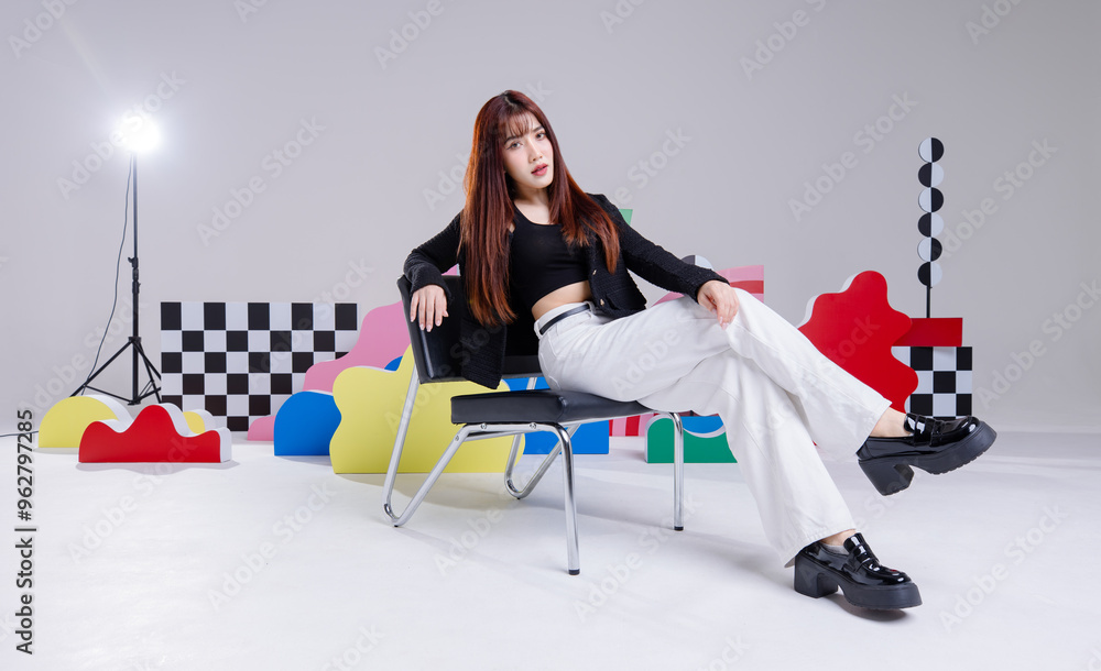 Fashion photo young confident woman model Asian beautiful female wearing trendy black color knitted short jacket, white jeans posing looking at camera sitting on chair in studio colorful background.