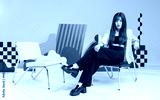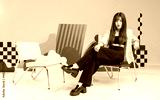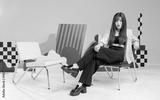 Fashion photo young confident brunette woman model Asian beautiful female wearing striped blue shirt and black pants posing looking at camera and sitting on chair in studio colorful background.