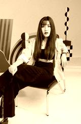 Fashion photo young confident brunette woman model Asian beautiful female wearing striped blue shirt and black pants posing looking at camera and sitting on chair in studio colorful background.
